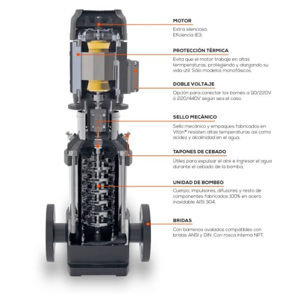 Motor 2 polos de alta eficiencia, silencioso, alta presión y alto flujo.