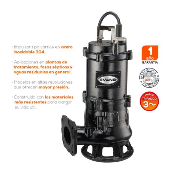 Bomba para solidos de máx. 1.37″, trifásica 220V, 2 Polos, 10m cable, impulsor de vórtice.