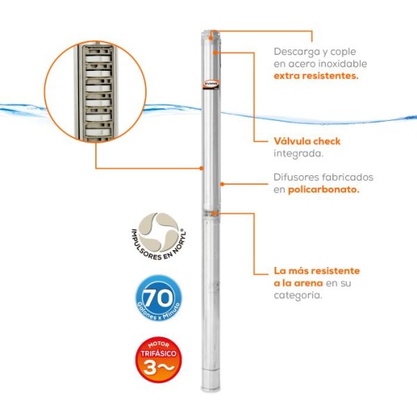 Bomba sumergible trifásica para pozo profundo 4″, 70 GPM, descarga de 2″, 7.5 HP. 220V